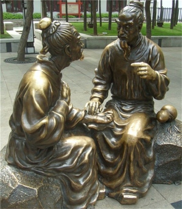 中醫文化歷史悠久,獨具特色。展現了中醫在進行號脈問診的情景,放置在醫院或者中醫診所是很合適的。鑄銅人物雕塑就是以各種銅雕人物為造型的雕刻藝術,用各種可塑材料或可雕,可刻的硬質材料創作出一定的可視,可觸的藝術人物形象。